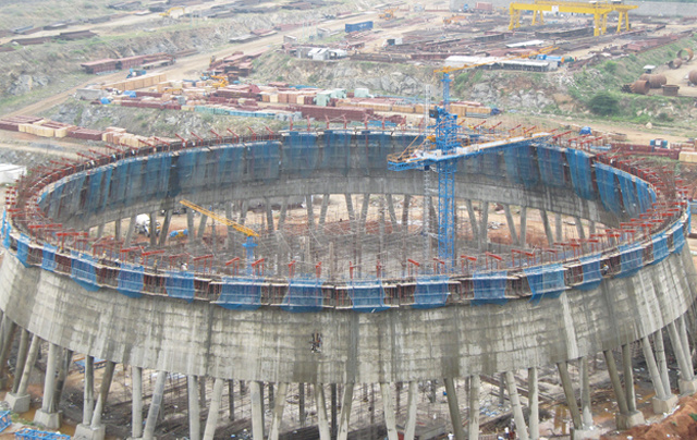 該機是冷卻塔施工的專用設備,與升降機配合使用,頂部塔機可以吊運鋼筋,塔身為升降機提供附著支撐,水平吊橋為施工人員和物料提供平臺。